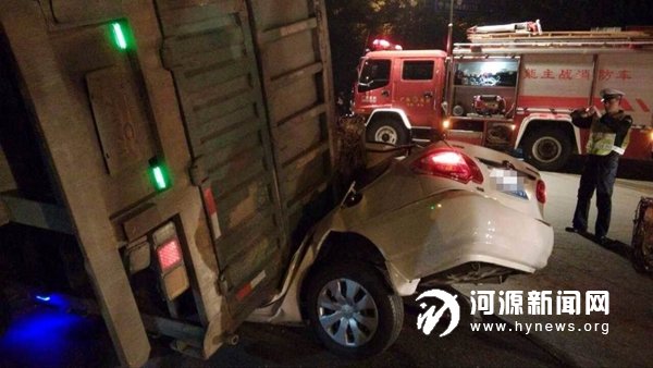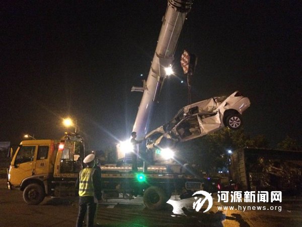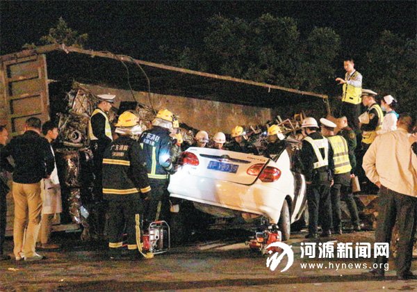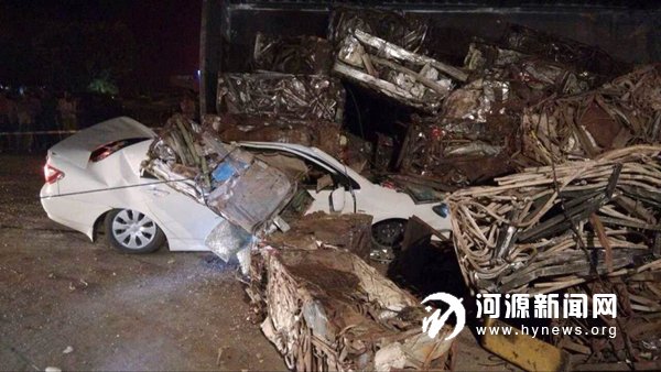 前天晚上9 时30 分许,205 国道城南高速路口红绿灯处发生一起交通事故,造成一人死亡。当时,一辆河源牌白色小车从惠州往市区方向行驶,怀疑为了躲避高速出口的红绿灯,从右侧加油站绕过时,与一辆从高速出口方向驶来的大货车发生碰撞。大货车侧翻,车上数十吨的废铁压在小车上,导致小车严重变形,小车司机当场死亡。公安交警、消防等部门接警后迅速赶至现场救援,具体事故原因仍在进一步调查中。