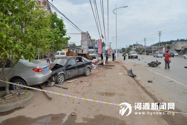 昨天下午3 点半左右,市区东环路临江桥附近发生一起交通事故,一辆黑色小轿车与一辆摩托车发生碰撞,造成4 人受伤。据事故现场旁边一家饭店老板娘称,当时黑色小轿车车速较快,与摩托车相撞后冲向路边把路边的电线杆也撞断了,连带停靠在路边的一辆银色丰田小轿车也无辜被撞,摩托车司机受伤严重,黑色小轿车上3 人不同程度受伤,车头严重损坏。事故发生后,交警很快到场处理,并把伤者送往医院治疗,事故原因正在调查中。