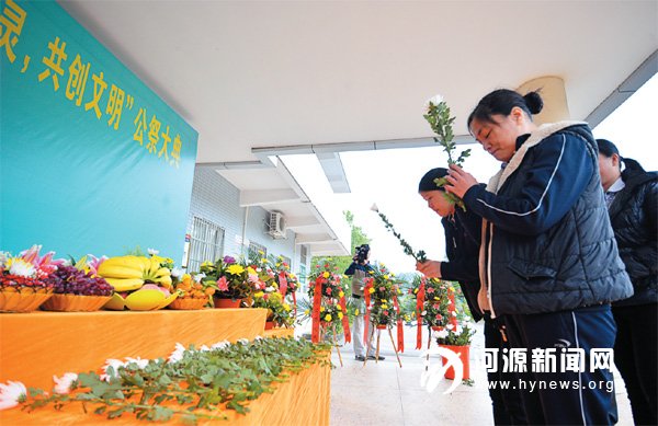 为逝者送上鲜花以表悼念。昨日上午,市殡仪馆举行“感悟生命、清明心灵、共创文明”公祭仪式,以悼念逝者。据了解,现寄存在市殡仪馆内的骨灰盒近8000 具,其中逝者因亲属在外地没时间回来看望、长时间无人拜祭的骨灰盒有近千具,市殡仪馆特意举行公祭仪式以悼念这些逝者。