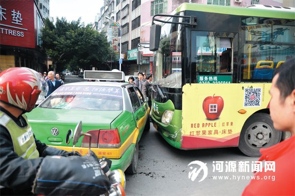 昨日早上8 点15 分左右,市区红星路与昌盛街交会路口发生一起车祸,一辆公交车与一辆出租车发生碰撞,所幸无人员伤亡。据目击者称,事故发生时两车速度较快,该路口又没有红绿灯,估计司机发现来车时,已经来不及刹车了。所幸两车碰撞并不严重,没有人员受伤。