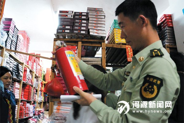 执法人员对化龙街一间三小商铺的消防设施进行检查。昨日下午,市公安消防局联合源城公安、消防、街道办等部门对市区化龙街“三小”场所进行大检查,并对化龙街商铺货物堆压、线路老化、使用明火等问题进行讨论,初步明确化龙街商铺整改要求:商铺禁止住人和使用明火;仓库货物堆压不能太过密集,必须留出一定通行空间,同时离照明灯管必须有0.5 米以上空间距离;老化线路需及时更换,所有电线必须套管;必须安装独立式烟感报警器和配备必要的消防设施。