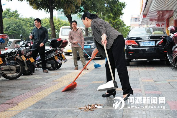 市委宣传部的干部职工在站前路开展大扫除行动。24 日下午,市区集中开展环境卫生大扫除行动,市直和中央、省驻河源副处以上单位干部职工到各单位责任路段参加了卫生大扫除,源城区直单位、镇(街道办)及村(居)的全体干部职工也在各自辖区内开展了大扫除行动。