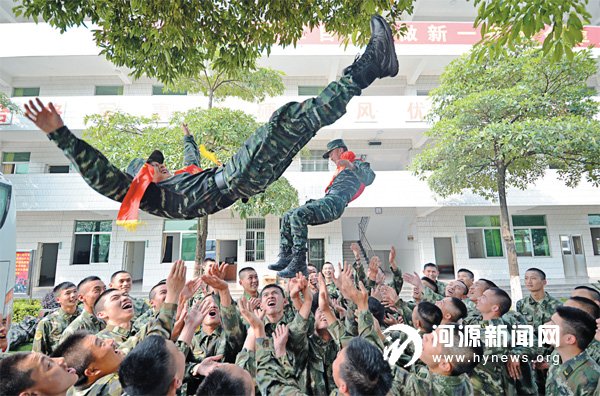 河源武警支队官兵为载誉归来的两位“勇士”庆祝。昨日下午,在约旦的第七届“勇士竞赛”国际特种兵比武中获得佳绩的张学春和孙广进回到河源,他们作为武警广东省总队特勤大队代表队成员拿到团体第四名,并在被各国代表队认为最具挑战性、被誉为王冠上的明珠的“国王的挑战”课目中获得第一名。