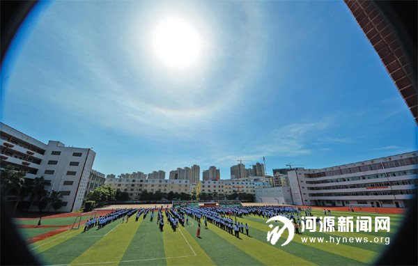 昨天上午9 时35 分,河源上空出现罕见的日晕现象,彩色光环绕在太阳周围,十分美丽。据了解,日晕是太阳光通过云层中的冰晶时,经折射或者反射形成的一种光学现象,日晕的出现通常预示着天气或有变化。