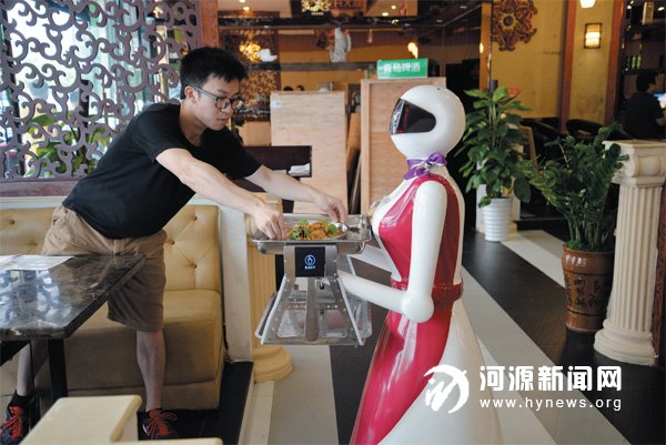 美女型送餐机器人将客人点的菜送达餐桌。昨天上午,经过近两天的调试后,位于市区兴源东路的槎城十三香餐饮店从深圳采购回来的美女型送餐机器人正式亮相,引来不少市民围观合影。这是我市首家利用机器人送餐的餐饮店,老板刘先生介绍,他的店内共购买了两台送餐机器人,每台6 万多元,主要是为客人提供更好的就餐环境,向更多的市民展示现代化科技成果,同时也是为了更好地节省人工成本。