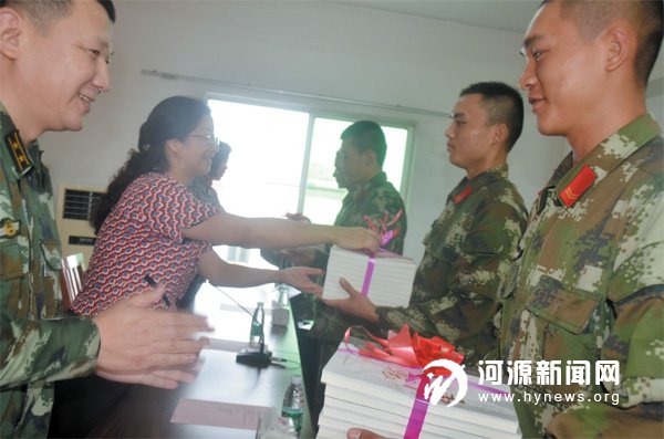 军爱民、民拥军。前日,“双拥文化进军营”赠书活动走进武警河源市支队,为武警官兵送上新的精神食粮。在赠书仪式上,副市长朱蔚蔚带领市文广新局和市图书馆的相关负责人,向武警河源市支队官兵代表送上了《我思无邪》、《车辙》等书籍30 多套。据了解,自2009 年3 月开展“警民共建图书流动服务站”活动以来,市图书馆已先后向武警河源市支队提供图书近万册,今年已向武警河源市支队送书约1500 册。