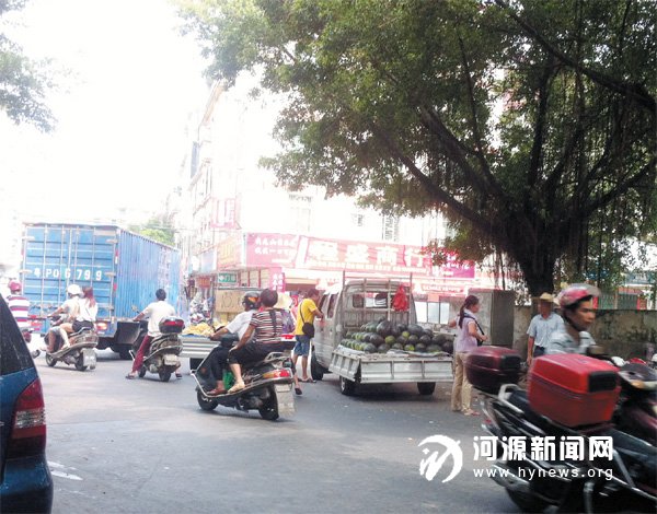 日前,有市民向记者反映,在市区沿江西路碧水湾花园附近的十字路口,有流动商贩使用农用车贩卖西瓜等水果,阻碍交通。记者在现场看到,商贩的农用车恰好停靠在车道上,不少市民就地讨价还价,还有一些开着摩托车的市民将车停在车道上选购水果。人群一聚集,这个十字路口就显得狭窄起来。有市民表示,水果商贩们在这里随意停车,不仅会阻碍交通,也给商贩自身带来安全隐患。
