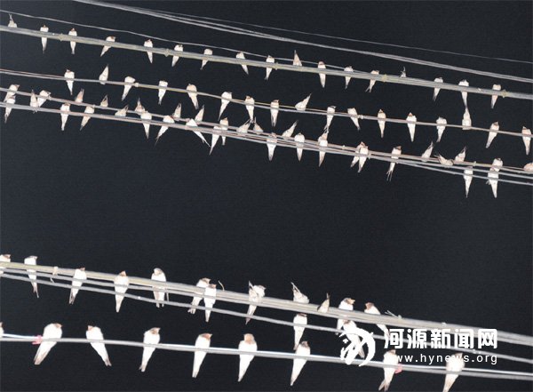 近日,在紫金县敬梓镇,每天傍晚都有超过千只的燕子飞来,整齐地停留在民居附近的电线上过夜,看去宛如五线谱上一个个跳动的音符。据了解,这一奇观已持续了好几天。“这些燕子是前几天出现在这里的,以前没有出现过这种现象。”村民廖先生告诉记者,刚开始时只飞来数只燕子停留在电线上,后来越来越多,最后成群结队。这些燕子行动很有规律,每天天黑后就安静地停在电线上面,直到第二天天快亮时才飞走。为何会出现这种现象,不少村民对此都很好奇。