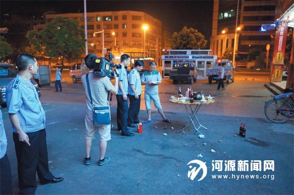 前晚11 时,市城管局城监大队启动了针对市区宵夜档违规经营现象的清理大行动,执法队员来到一些违规宵夜档口前,迅速对违规占道的各种桌凳招牌等进行收缴。据了解,这样的执法行动每周将不定期进行两次,重点打击宵夜档口乱摆放、占道等违规经营行为,助力巩卫迎检工作。