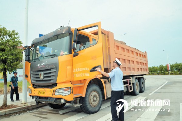 昨日下午,在市区沿江东路路段,一辆满载沙子的泥头车没有做任何遮盖措施便上路行驶,执法人员现场将其拦下进行依法查处。