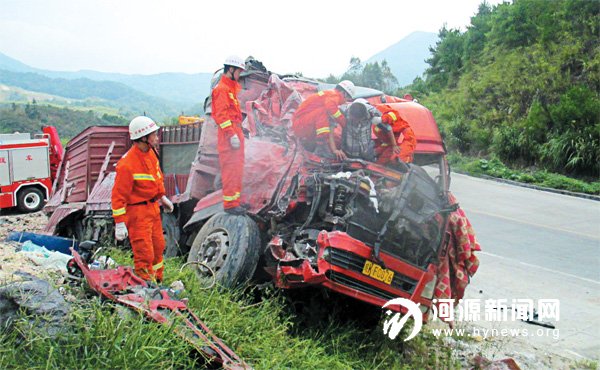 日前,和平县大坝合水塘发生一起交通事故,有两人被困车内。消防队员到达现场后,发现一辆大货车撞在公路边的沙石堆上,路边散落部分货车零件,车头、车厢严重撞击变形,两人被困在车内无法动弹。消防官兵利用液压工具对驾驶车门进行破拆,将被撞扁的车头拆解。经过20 多分钟的紧张救援,被困的两人被救出。
