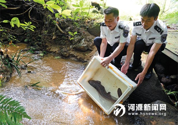 日前,市农业局水产部门一行来到河源水坝娃娃鱼放生保护区,将查获的娃娃鱼放生。据了解,8 月上旬,市公安局森林分局会同源城森林派出所查获1 宗非法收购、运输野生保护动物案件,其中缴获的3 条娃娃鱼因属于国家二类保护水生野生动物,按照相关程序交由农业局水产部门处理。