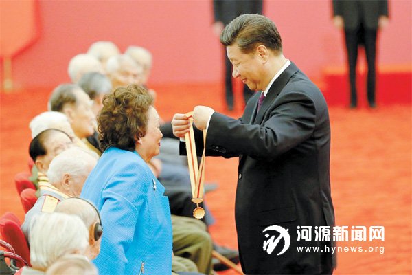 习近平向陈纳德将军的夫人陈香梅女士颁发纪念章。9月2日上午,中共中央总书记、国家主席、中央军委主席习近平在北京人民大会堂向30名抗战老战士、抗战将领、为中国抗战胜利作出贡献的国际友人或其遗属代表颁发纪念章并发表重要讲话。