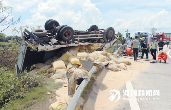 9 月4 日中午,在粤赣高速江西往灯塔路段(距离灯塔镇100 米处),一辆装满猪饲料的货车因速度过快,一头扎进高速公路匝道上的防护栏,货车翻了个“四脚朝天”,猪饲料撒满一地,车头严重变形,司机被困驾驶室。东源消防接警后,迅速出动两辆消防车、10 名指战员火速赶赴现场救援。经过15 分钟的紧张施救,被困司机被成功救出,并交由医护人员救援。