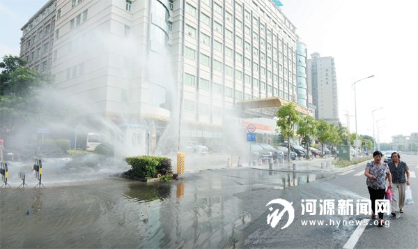 昨天上午8:50许,记者在沿江东路迈豪酒店附近看到,人行道旁的绿化带里的自动喷头喷出数米高的“喷泉”,呈孔雀开屏的水雾越界喷向附近的两条道路,行人只能纷纷绕道。自来水公司接报后,抢修工作人员第一时间赶到现场抢修。据抢修人员介绍,造成此次“高喷”的原因是附近水管阀门损坏所致。