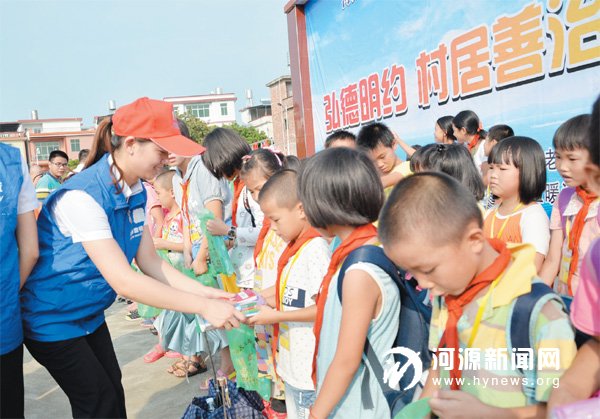 昨日,2015 年“南粤幸福活动周” 暨东源县“弘德明约,村居善治”基层社会治理创新试点启动仪式在东源县顺天镇金史村文化广场举行。据悉,今年 “南粤幸福活动周”以“和谐、创新、健康、幸福”为主题,我市将组织社会组织、志愿者服务队开展慰问留守儿童、老人以及义诊、普法宣传、文艺表演、徒步、助学等系列活动。图为社工师联合会社工为留守儿童送上学习用品。
