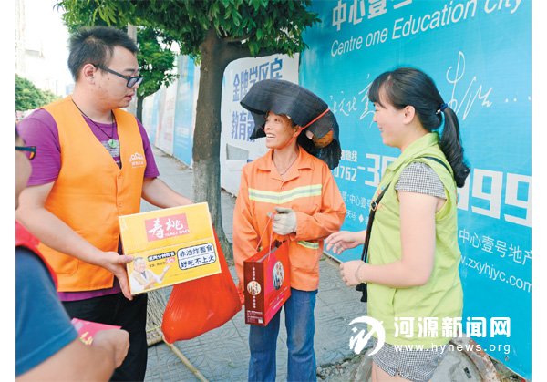 昨日,新客家人服务队的志愿者们走上大街,为还在中秋节维护城市环境的环卫工人们送去了月饼、面、水果、慰问金,祝福他们节日快乐,感谢他们一直以来为市区环境做出的贡献。据了解,此次慰问是团区委、区流动人口户主联合会、河源晚报等主办的 2015 南粤幸福活动周暨“关爱他人温暖中秋”的系列活动之一,此次活动共慰问了7 户外来务工环卫工人,4 户东源县涧头镇的特困家庭。