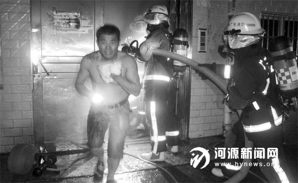 一名被困群众被救出后,仍惊魂未定。10 月5 日晚上10 时02 分,源城消防大队特勤中队接到报警称,高埔岗高埔市场万利来商场后面一出租屋着火。特勤中队紧急出动3 台车13 名指战员赶赴现场处置。到达现场后,经过侦察发现为一楼楼梯间停放的摩托车着火,浓烟已弥漫整栋楼,楼上有大量人员被困。经过紧张营救,消防官兵成功救出13名被困群众。