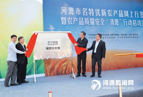 随着电子商务的高速发展,拥抱互联网已成为大趋势。在昨日上午举行的名特优新农产品网上行签约仪式上,我市与国内和本土知名电商平台签订多项合作协议,探索“互联网+农业”的新路子,开启河源农产品销售新时代。当天还举行了苏宁易购河源特色馆揭牌仪式(如图)、“河源农业”微信平台上线仪式,启动了农产品质量安全“清源”行动,市领导何忠友、黄建中、黎意勇、章权等参加了活动。