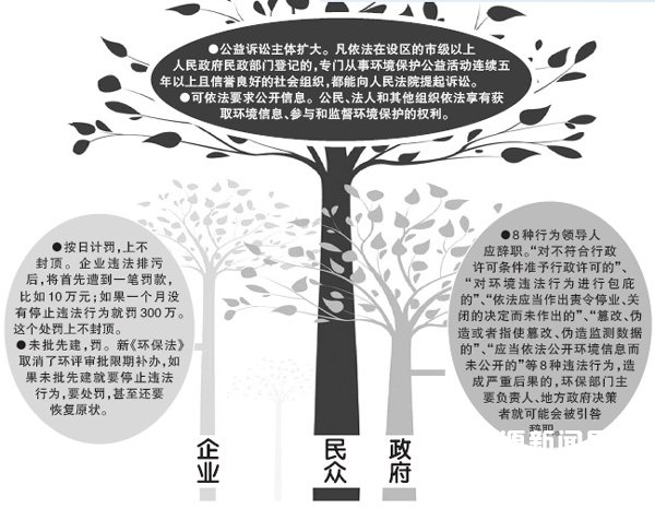 对于社会长期诟病的“违法成本低,守法成本高”问题,新《环保法》打出重拳,规定将企事业单位和其他生产经营者的环境违法信息记入诚信档案,及时向社会公布违法者名单,同时明确规定了按日计罚制度。此外,对超标排放的企事业单位,环保部门可责令其停业整治、关闭。违法排放污染物构成犯罪的,还要依据刑法的有关规定追究相关人员刑事责任。