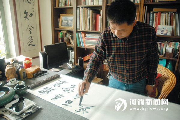如今,林冠明每天伏案数小时,双手不断地染墨,不断地用凉水洗涮,手背上可以清晰地看见道道裂纹。由于长时间的伏案写字,他的颈椎和腰椎时常酸痛不止,眼睛都花了。走进他的书房,你看到的始终是一个戴着眼镜,半弓着腰提笔挥墨的汉子。