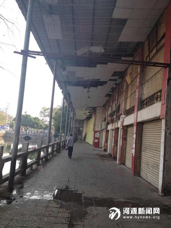 据记者目测,这个挡雨棚距离地面大概有5 米高,长度有100 多米,记者数了一下,该挡雨棚下面大约有15 个档口。挡雨棚是用铁皮搭建而成的,下面是铁棍搭起框架,上面是石膏粉制成的天花板。不过记者看到,这些石膏粉做成的天花板已经脱落了很大一部分,只有生锈的铁质框架裸露在外面,整个挡雨棚显得很破旧。