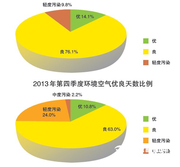 据市环境监测站监测,去年第四季度(有效天数92 天),市区环境空气质量优良天数为83 天,其中优为13 天、良为70 天,轻度污染为9 天;2013 年第四季度(有效天数 92 天),市区环境空气质量优良天数为68 天,其中优为10 天、良为58 天,轻度污染22 天,中度污染2 天。再将时间段缩小,今年1 月1 日至26 日,市区环境空气质量优良天数为22 天,其中优为2 天、良为20 天,轻度污染4 天;去年1 月1 日至26 日,市区环境空气质量优良天数为16 天,其中优为2 天、良为 14天,轻度污染10天。