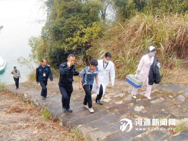 通过值班民警耐心细致地询问,受伤群众提供了一个重要线索,称其刚才看见一艘船从他远处经过,根据这一重要线索分析,受伤群众可能摔在一个叫“葫芦凹”的地方。此时120 救护车、消防车已赶到现场随时待命。所长魏海洋马上联系新丰江电厂相关负责人,派人开快艇带值班民警和医护人员到附近水域搜索,经过两个多小时的水上搜索,终于在“葫芦凹” 一处偏僻的水域找到受伤群众。随后,值班民警配合医护人员对伤者进行了简单的伤口处理,并将受伤群众抬上救援船。