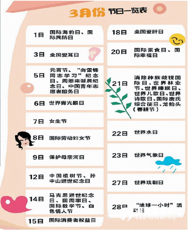 “原来3 月份有这么多的节日啊,我还真不知道呢。”市民缪女士在了解到记者盘点的3 月份节日多达32 个时,她表示很惊讶。缪女士说,一直以来,她都以为3 月份只有4 个节日,就是三八妇女节、植树节、消费者权益日和气象日。