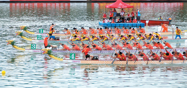 端午节,赛龙舟是传统节目。图为端午节前夕,在市区黄金水道举行的广东省龙舟锦标赛。本报记者 谭兴孚 摄