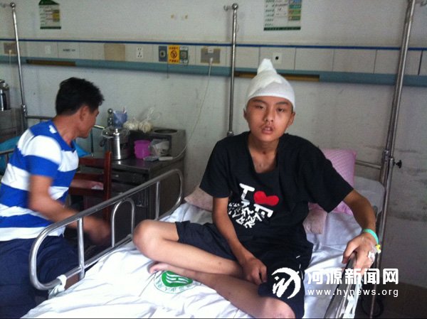 昨日,记者来到市人民医院住院部7 楼,看见少年安静地躺在病床上,头上包着纱布。看到记者的到来,他礼貌地坐了起来。由于车祸受伤,少年说话非常吃力。