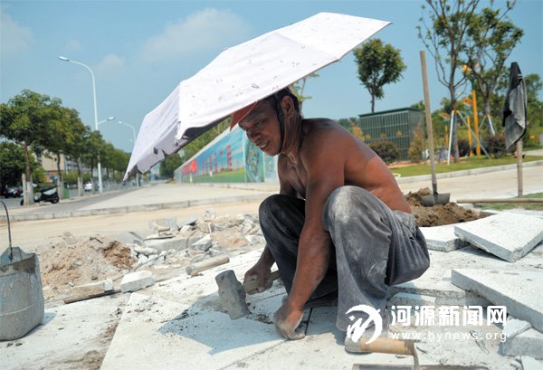昨日上午11 点,记者来到市儿童公园建筑工地,毒辣的阳光滚烫得让人喘不过气来。来自广西的工人李英德正顶着烈日和工友合力铺设花岗岩地板,工作中的李英德光着膀子,皮肤黝黑,头戴一顶自制的 “伞帽”,不时擦拭着脸上的汗水。