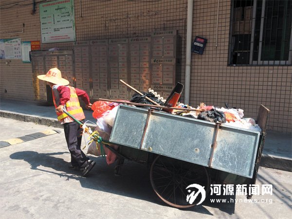 每天从凌晨3:00至晚上9:00,除了中间短暂的早餐和午餐的休息时间,陈阿姨的身影都会出现在大同路。这个路段没有树荫遮阳,连续多日的酷热天气,把陈阿姨的脸颊、脖颈和手臂都烤得通红。“中午11:00多的太阳,烤得脸和背都火辣辣的,全身是汗。”陈阿姨说,她是四川人,2005年追随丈夫来到河源买了房安家落户后,就一直做环卫工作。