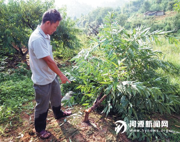 今年,谢文学家的鹰嘴桃丰收,价钱也卖得好,卖完桃子后正准备给桃树加肥料,让前年刚种下的桃树来年能结好果子。可万万没有想到,8 月2日上午他发现自家桃园中的75 棵桃树竟然被人砍掉,已慢慢枯黄死去。看着这些倒地的树干,谢文学有苦说不出。