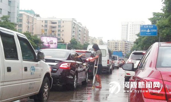 昨日,中山大道,一中年男子不顾安全在车流间乞讨。