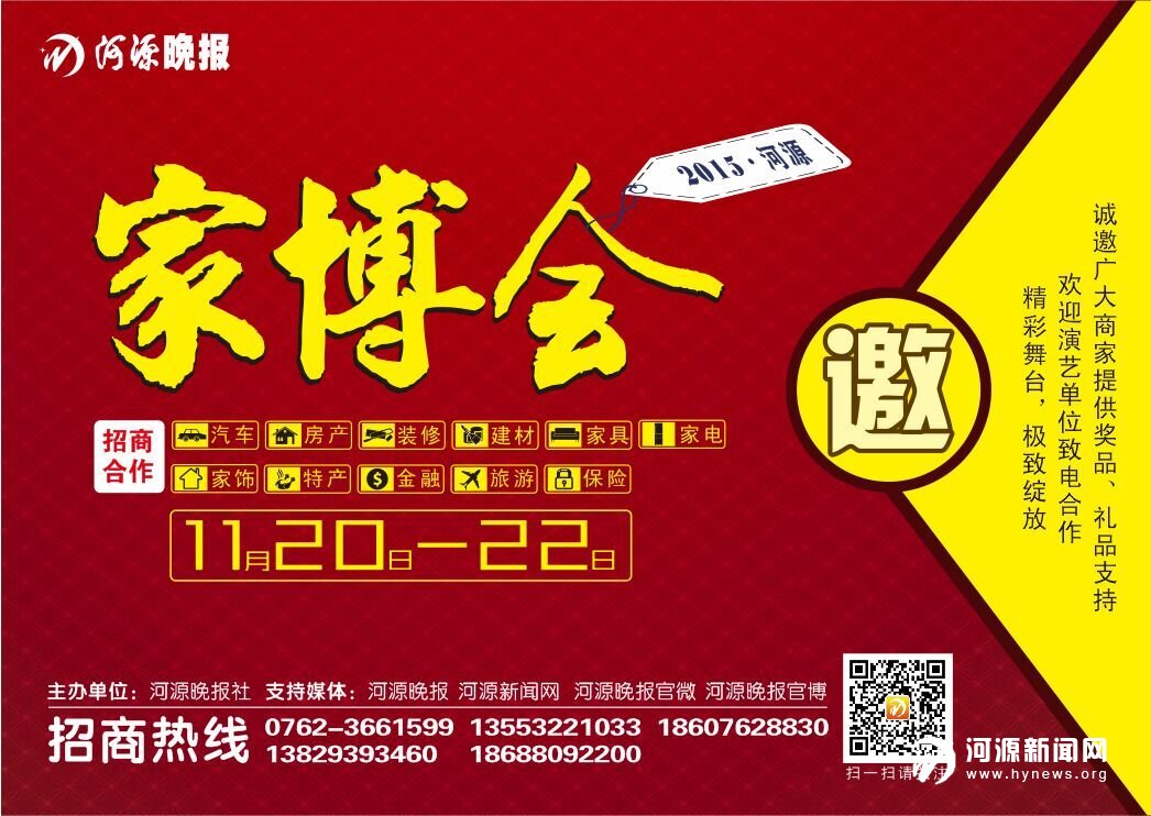 2015 年河源家博会招商范围:汽车及汽车精品、房产、建材装饰、家用电器、家居产品、特产、金融、旅游、保险等。家博会招商热线:0762-3662069。