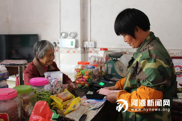 龙川县鹤市镇河布村有近700 名60 岁以上老人,有些老人不会输密码,到3 公里外的镇上去取钱,很麻烦。自从以“商誉通”转账电话为支付结算终端的“农村金融服务站”落户村口的小店后,村民们再也不用到圩镇或县城的金融网点取钱了。6 日下午, 67 岁的黄友兰揣着邮政储蓄银行的存折和身份证走到村口店里,支取养老保险金。小店经营者黄素娟接过存折,放到POS终端机上刷了刷,显示余额290 元。“取250 元吧。” 老人想了想说。黄素娟帮老人输入密码交易完成后,给了黄友兰250 元现金。随即,银行后台将把250元转到店主的账户上。
