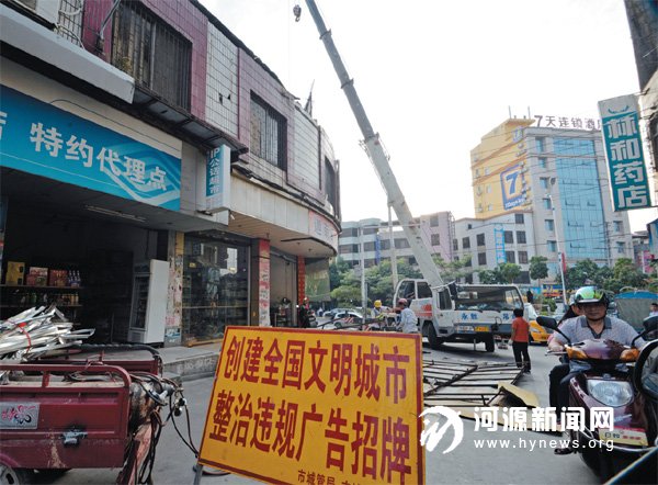 工作人员在拆除户外违规广告牌。本报记者 陈仕平 摄