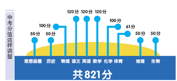2015 年初中学业考试总分由2014 年的 713分变为821分。《方案》中明确:2015年初中学业水平考试总分由文化科总分和体育分组成。文化科总分760分,其中思想品德、历史、地理、生物卷面分100分,均按50%计入总分,体育按文化科总分的8%计入总分,即61分。