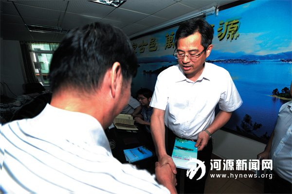 何忠友给市发改局的干部职工发放学习资料。朱冀 摄