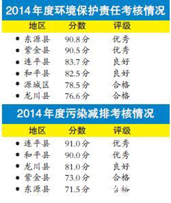 结合市环保局通报的2013年度环境保护责任考核结果,东源县连续两年获评为优秀,连平从合格升为良好,龙川则从良好降为合格;在污染减排考核方面,连平、和平从合格升为优秀,而紫金、东源则从优秀降为合格。