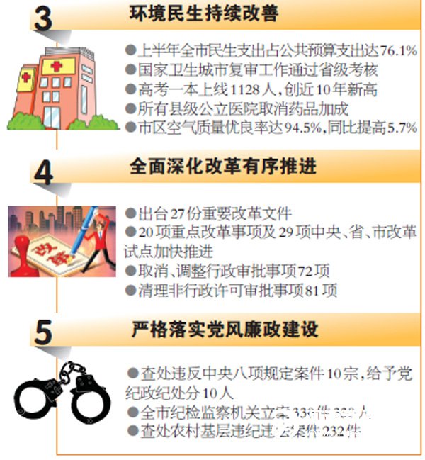 全会认真总结了我市上半年的工作。全会认为,今年以来,我市深入贯彻落实 “四个全面”重大战略,认真落实中央和省一系列稳增长、调结构、促改革、惠民生的决策部署,积极主动适应经济发展新常态, “三大抓手”扎实推进,转型升级步伐加快,环境民生持续改善,改革法治有序推进, “三严三实”专题教育扎实开展,全市经济社会发展呈现稳中向好的态势。