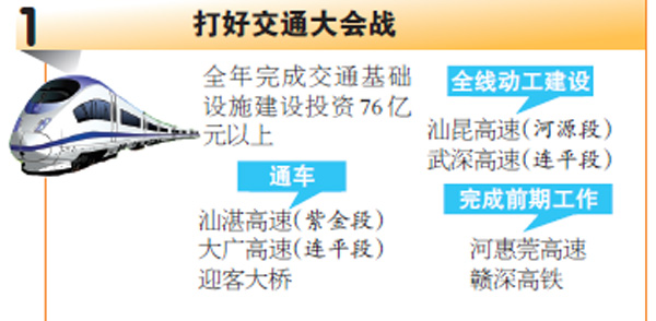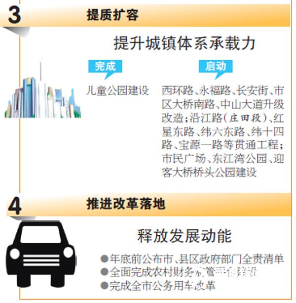 全会指出,下半年,全市面临的经济形势仍然严峻复杂,肩负的发展任务依然艰巨繁重,全市上下要紧紧扭住“ 三大抓手”,坚决守住“两条底线”,深化对口帮扶工作,抓紧抓实“三赛”项目,确保全年目标任务不折不扣地完成。会议强调,要突出抓好高速高铁,提升基础设施支撑力;突出抓好转型升级,提升主导产业竞争力;突出抓好新区开发,提升城镇体系承载力;突出抓好共建园区,提升对口帮扶带动力;突出抓好环境治理,提升绿色增长持续力;突出抓好“十件实事”,提升社会民生保障力。