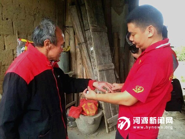 “最美志愿者”黄飞跃回访被蛇咬伤的孤寡老人。