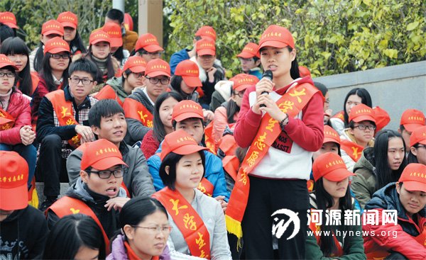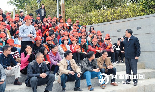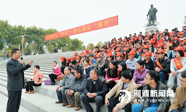 在昨日的座谈会现场,市城管局局长张金城、河源晚报社常务副总编辑王正明等相关负责人与 150名大学生志愿者在孙中山铜像前进行革命传统教育后,一齐坐在客家文化公园阶梯上,进行“零距离”交流。
