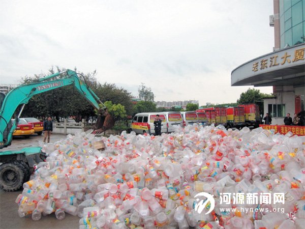 老东江公开集中压碎回收的空旧油瓶。