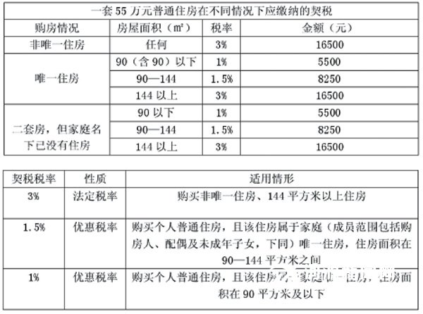 以小源为例,由于小源这套55 万元的房屋既是144 平方米以下的普通住房,又是他的唯一住房,他可以享受税率减半(即1.5%)缴纳契税,税款为8250 元。如果再加上此后为房产证贴花的5元印花税,也就是说小源购买房屋一共需要交8255 元的税。