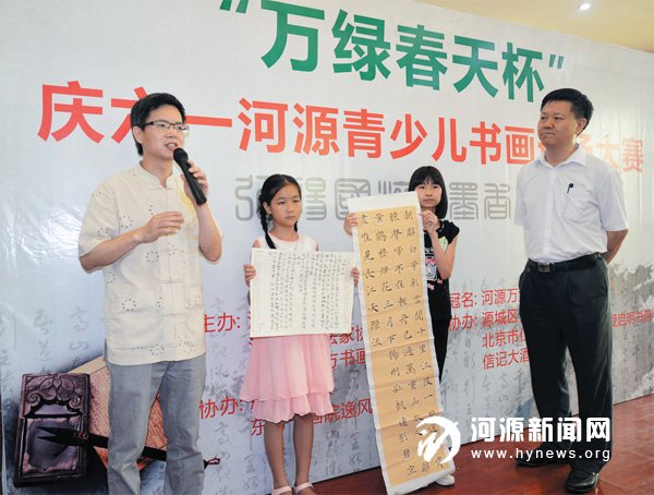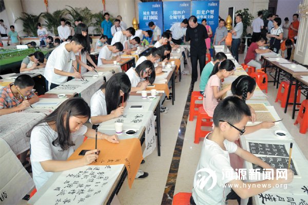5 月30 日,骤雨初歇的万绿春天售楼中心繁花似锦、绿树掩映,到处洋溢着“六一” 国际儿童节的欢乐气氛。由河源万绿水乡投资有限公司冠名,河源晚报社、河源市书法家协会、河源市东方书画院主办,源城区光明学校及胜林阁、北京仁爱慈善基金会、仁爱启明书院等协办的“弘扬国粹墨香古邑”、“万绿春天杯”河源青少儿书画现场大赛如期在这里举行。当天,近两百名青少年喜聚于此,徜徉在书画殿堂,畅享欢乐童年。