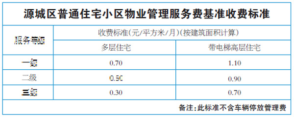 记者采访时了解到,《细则》出台后,源城区随后不久便公布了该区普通住宅小区物业管理收费的基准收费标准,实行政府指导价的物业服务收费按照服务等级进行收费,且上浮幅度不能超过30%。据悉,源城区将物业服务企业的服务等级分为了三级,按照基准收费标准,该区最高级的带电梯住宅每平米的物业管理服务费为每月1.1 元。也就是说,即使上浮30%,源城区实行政府指导价的物业管理收费每平米最高也不能超过1.43元/月。