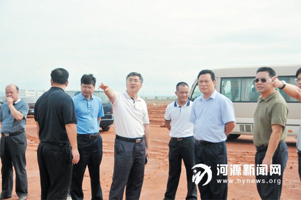 县委书记钟明(右二)和县长俞志锋(左二)到工业园指导园区扩园工作。